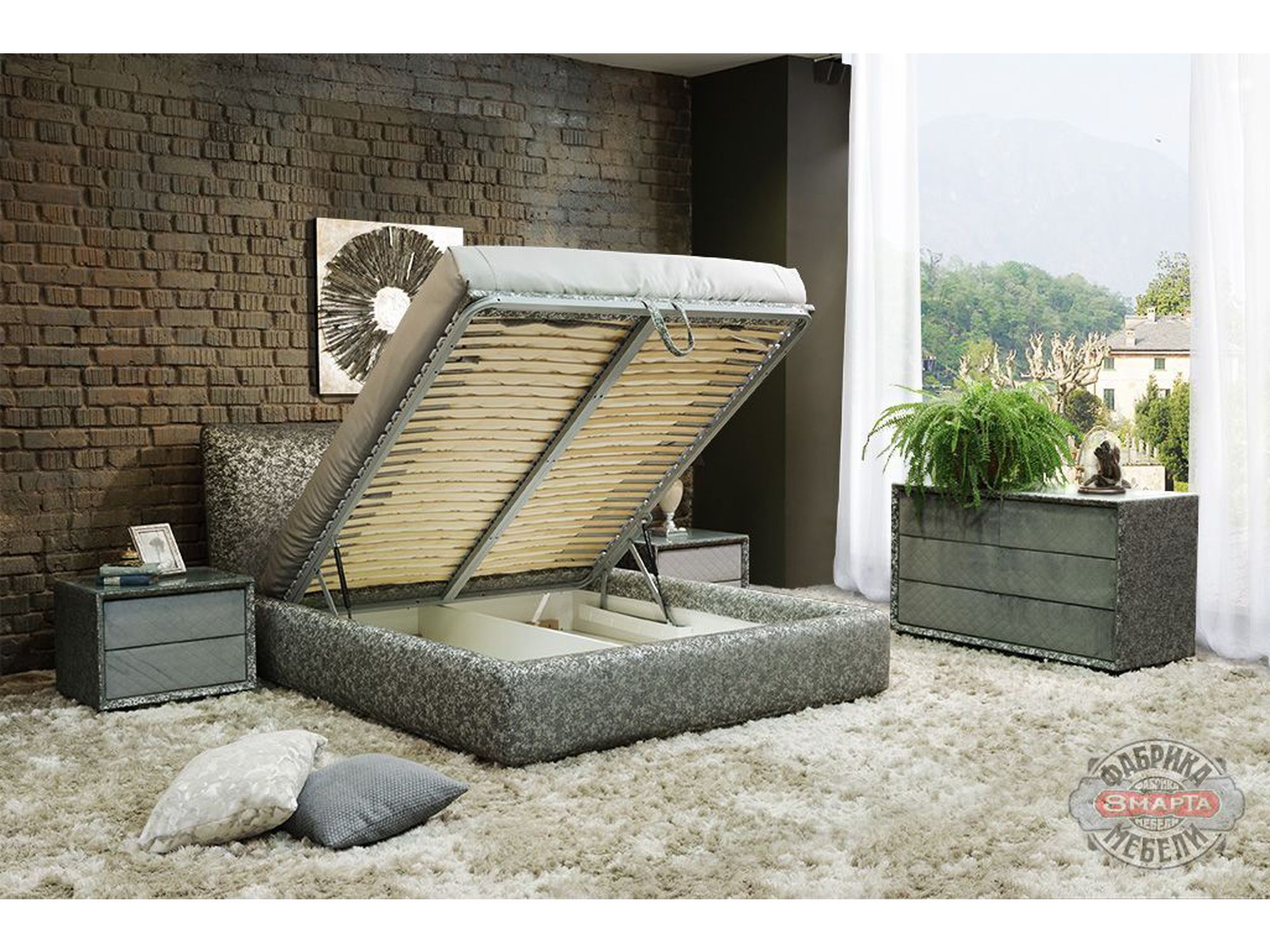 Настил изголовья и царги комбинированный и включает в себя гипоаллергенный пенополиуретан (ППУ) разной степени плотности и толщины и холлофайбер |