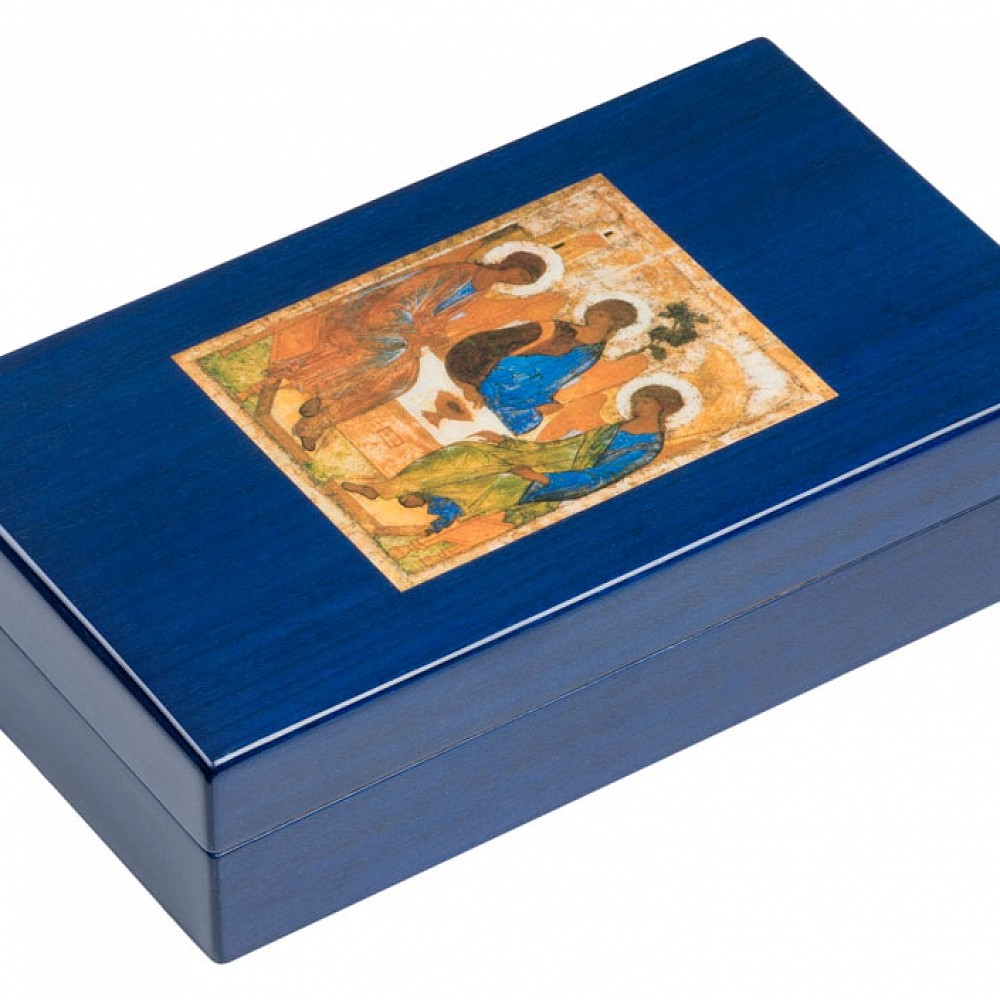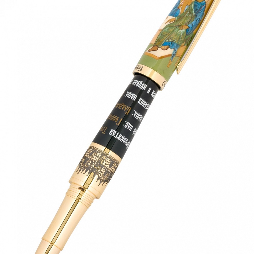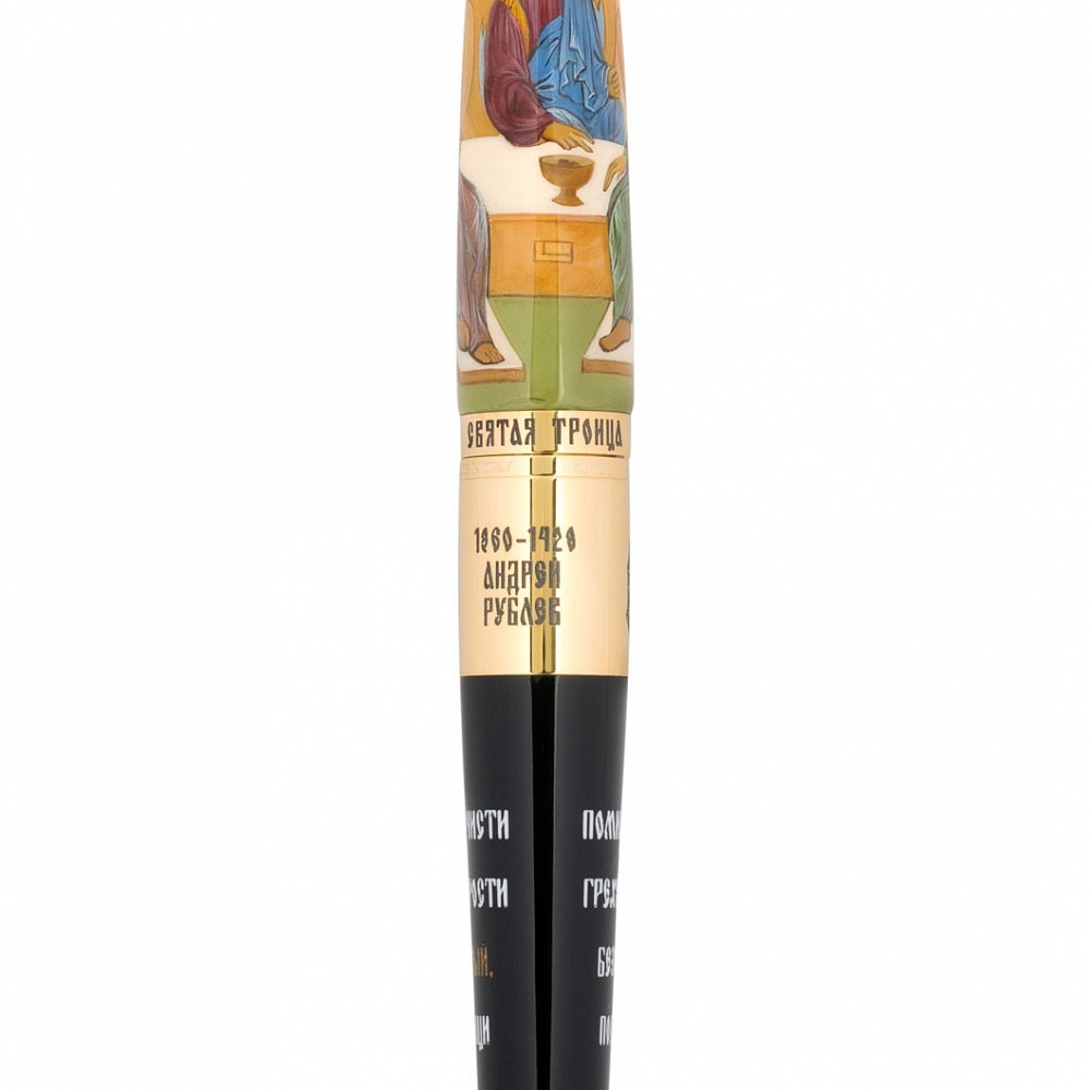 Роспись колпачка, на который помещено изображение иконы «Троица» Андрея Рублева, виртуозно исполнена мастерами лаковой миниатюры подмосковного села Федоскино, известного во всем мире уникальной техникой росписи черно-лаковых изделий из папье-маше. С конца XVIII века эта техника не претерпела изменений: мастера миниатюрной живописи способны переносить на лаковую поверхность сложнейшие произведения живописи и иконописи, филигранно выписывая каждую деталь. Исполнение подобных живописных миниатюр требует невероятного мастерства, а на роспись любого изделия порой уходят месяцы кропотливого труда. В центре позолоченного серебряного пояса на средней части ручки выгравированы изображение Троицкого собора Троице-Сергиева монастыря, имя Андрея Рублева и даты жизни Преподобного. Тело ручки украшает текст молитвы: «Пресвятая Троице, помилуй нас; Господи, очисти грехи наша; Владыко, прости беззакония наша; Святый, посети и исцели немощи наша, имене Твоего ради». Перо сделано из 18К золота и декорировано выгравированным изображением стилизованного креста, которое также украшает верхнюю часть колпачка ручки. Лимитированное издание – 222 ручки (111 – перьевых и 111 – роллеров).